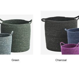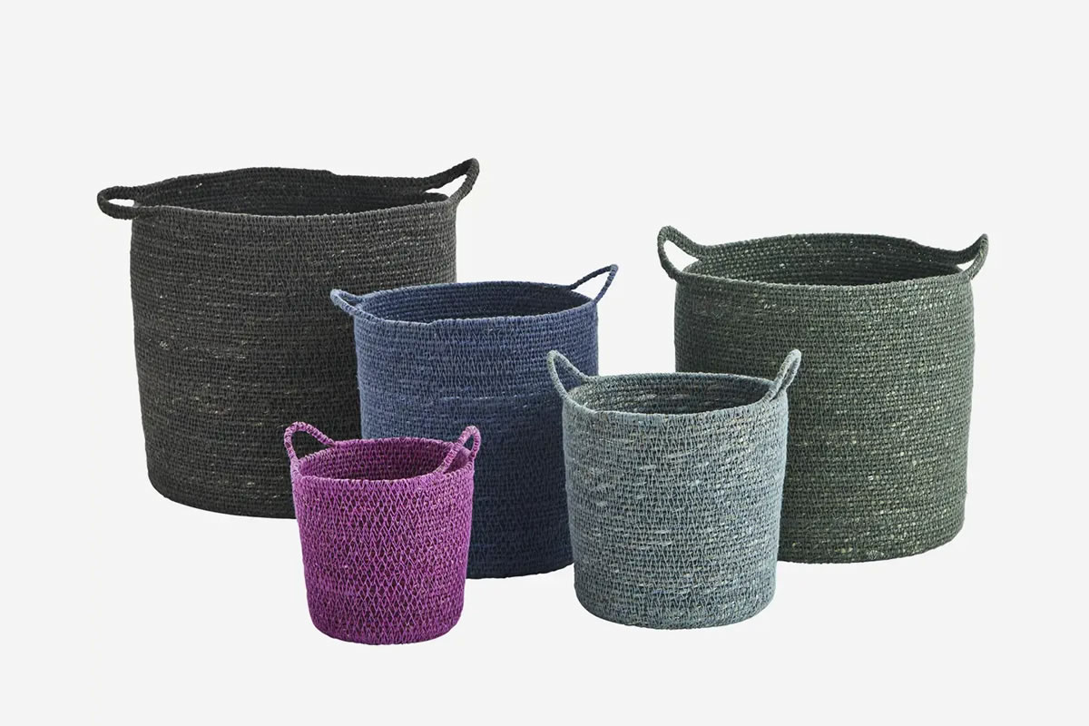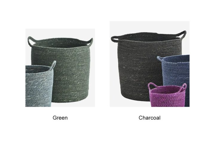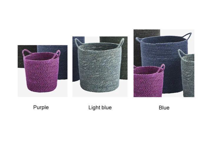 Description: Seagrass baskets made by Madam Stolz. Handmade, brightly colored, they are an elegant and eco-friendly way to store your things in style. Available in various sizes, each with its own colour.