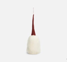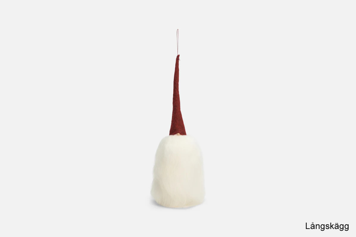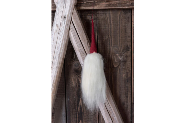 Description: Gottland wool Santa Claus hanging gnome designed by Åsa Götander for Asas Tomtebod. Perfect for the holidays, to embellish your tree with the spirit of Christmas. The variations that are created in the color and shape of the beard and hair make each of them unique. Dimensions: about 40 cm.