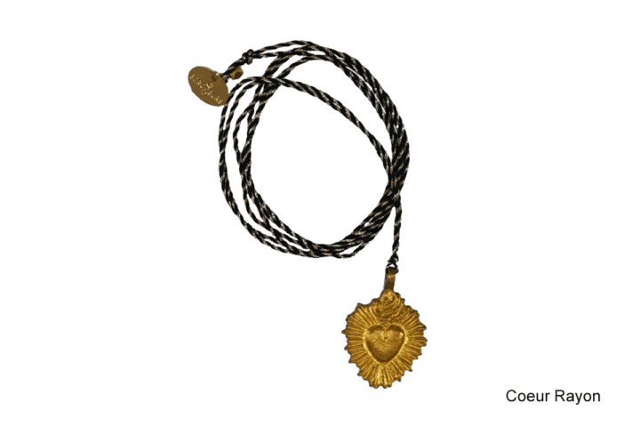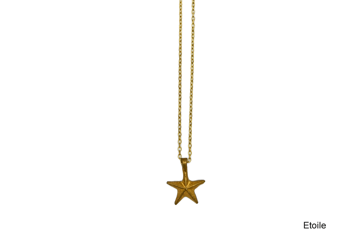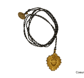 Description: Brass necklaces from the ex voto collection produced by Boncoeurs. A pleasure to wear or give as a gift! Available in various versions: Coeur, Etoile, Lune: chain 32 cm, pendant 2.2 x 1.8 cm; Coeur Flamme chain 40 cm, pendant 5 x 2.6 cm, Ailes, Coeur Rayon: chain 45 cm, pendant 3 x 2 cm.