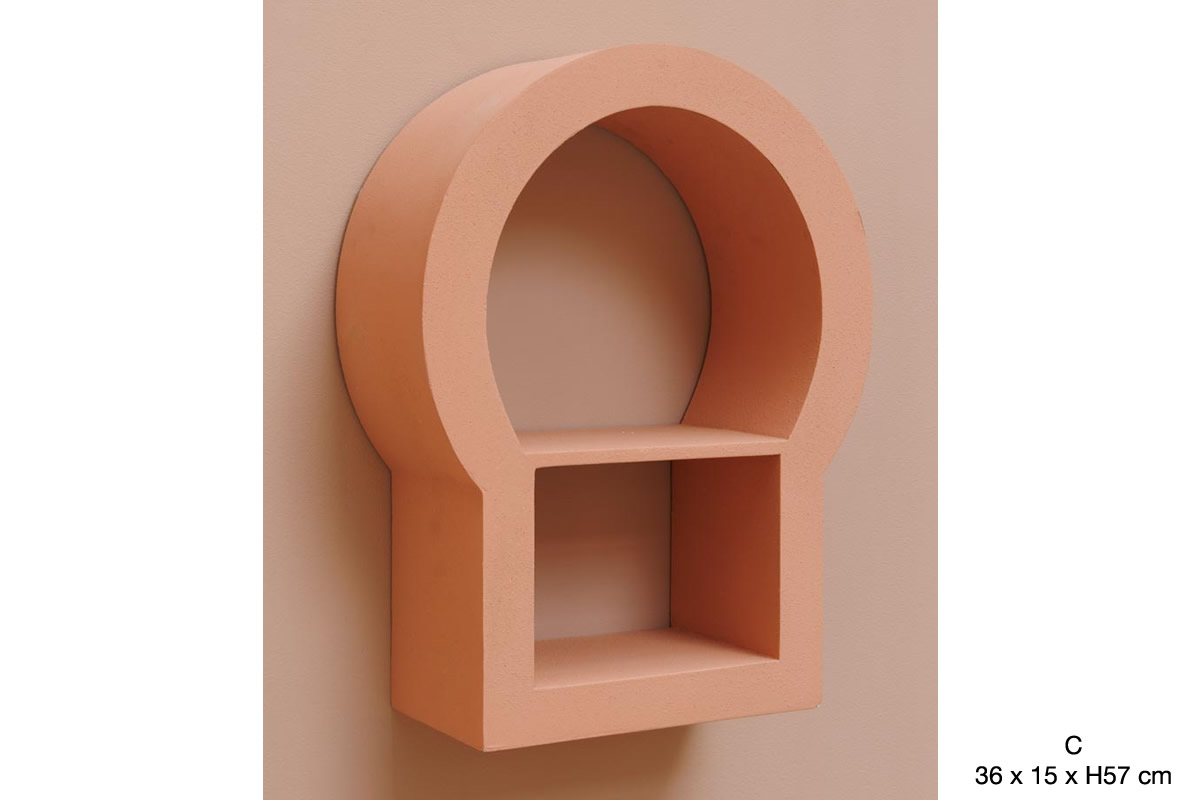 Description: Terracotta shelf made by Chehoma. Modern and minimalist design, characterized by clean lines and a simple geometric shape. Its timeless aesthetic suits a wide range of furnishing styles, from contemporary to classic. Available in various versions: A 30 x 16 x H 51 cm, B 25 x 14 x H43 cm, C 36 x 15 x H57 cm, D 50 x 15 x H38 cm, E 27.5 x 15 x H52 cm.