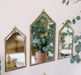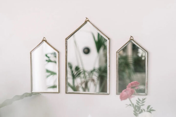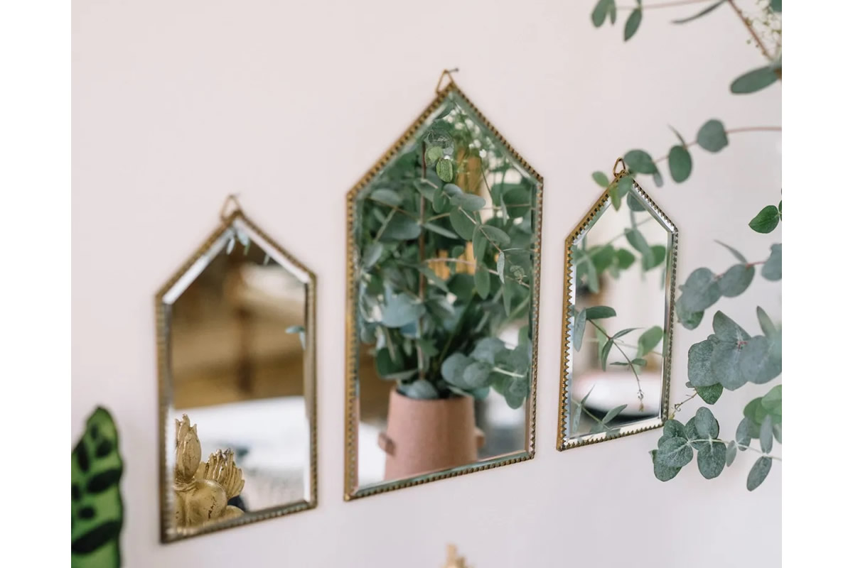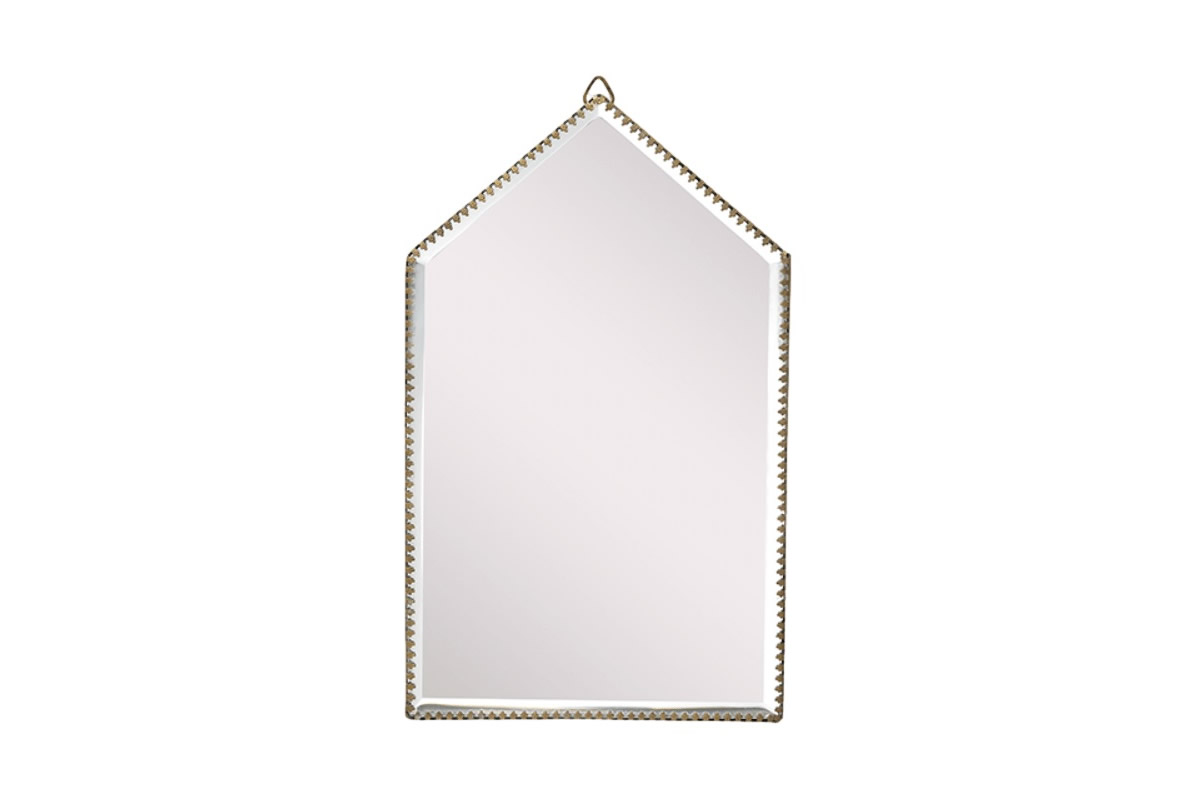 Brand: BoncoeursDescription: Temple-shaped mirror made by Boncoeurs. Made from embossed tinplate, hand patinated, giving it a beautiful color and antique style. Has a hanging ring, dimensions: Small 22,2 x 12,4 cm, Large 29,8 x 18,2 cm.