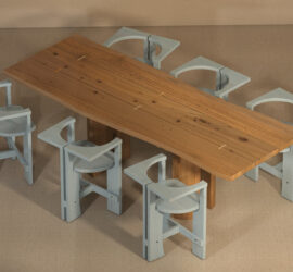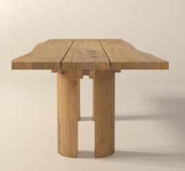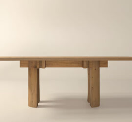 Brand: MonostudioDescription: Cedar wood table made by Monostudio. An elegant table with a sculptural design, designed to adapt to modern and refined spaces. A robust and contemporary appearance, with a strong visual presence, with natural grains that add character and warmth to the surrounding environment. Dimensions: 225 x 85 x H74 cm.