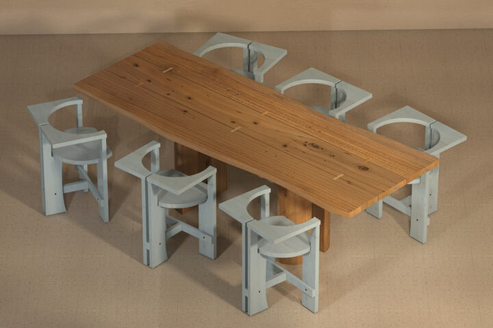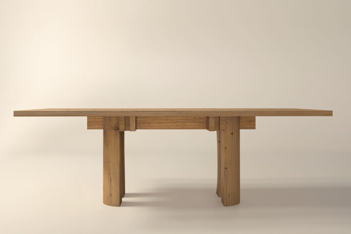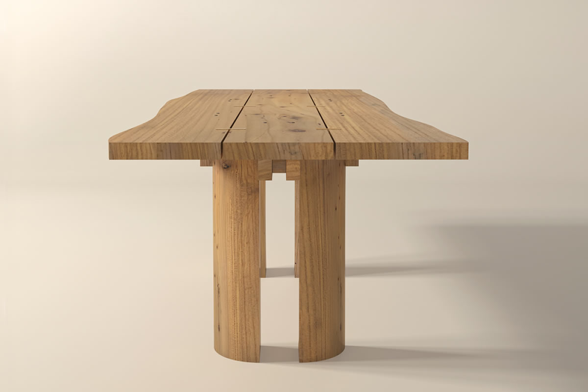 Brand: MonostudioDescription: Cedar wood table made by Monostudio. An elegant table with a sculptural design, designed to adapt to modern and refined spaces. A robust and contemporary appearance, with a strong visual presence, with natural grains that add character and warmth to the surrounding environment. Dimensions: 225 x 85 x H74 cm.