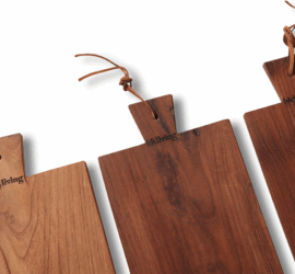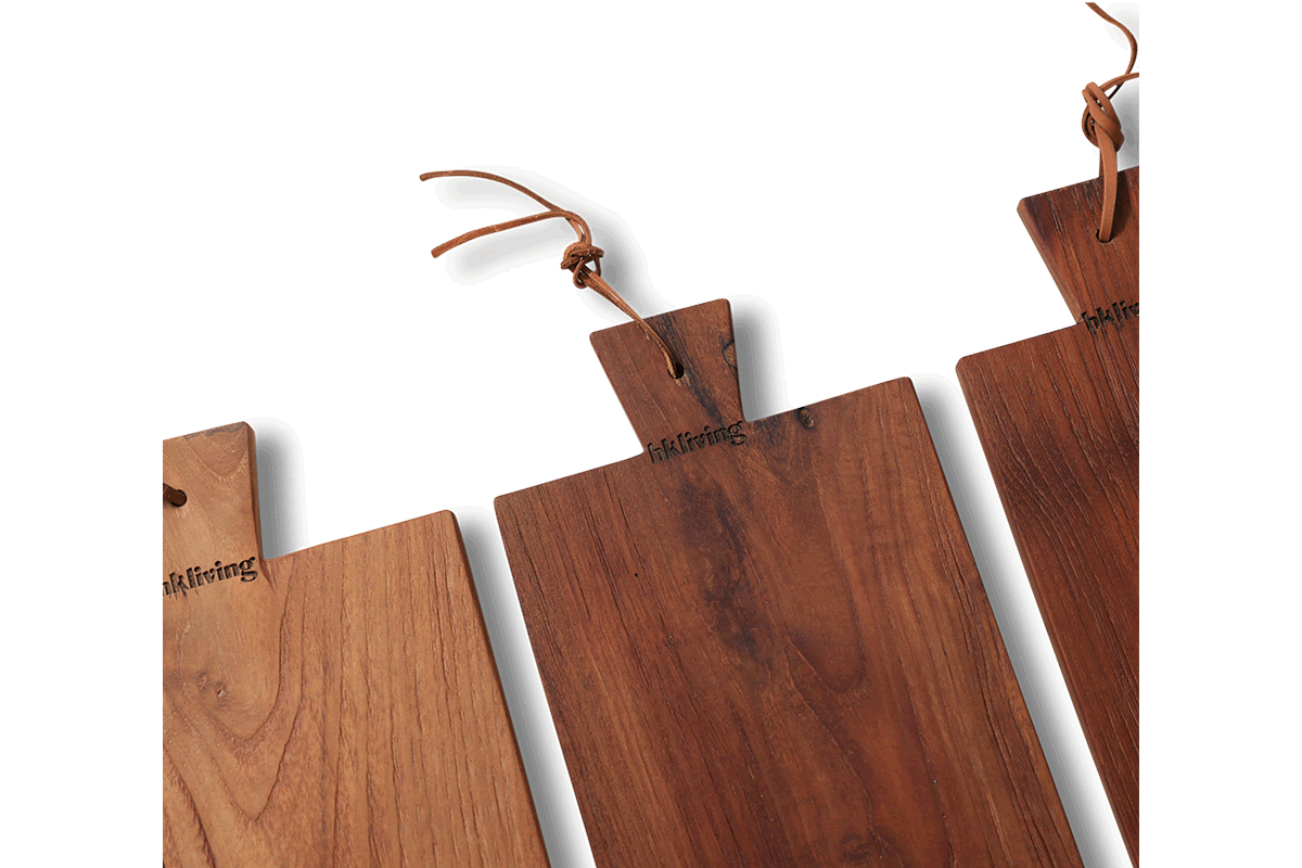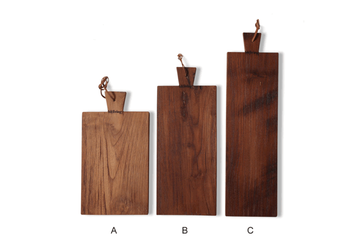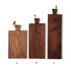 Description: Teak wood cutting boards, made by HK living. It combines beauty and functionality in a single kitchen accessory, resistant to water and wear, ideal both for daily use and for elegantly serving bread, cheeses, cured meats or appetizers. Dimensions: A 31 x 16x cm, B 38 x 15 cm, C 47 x 12 cm.