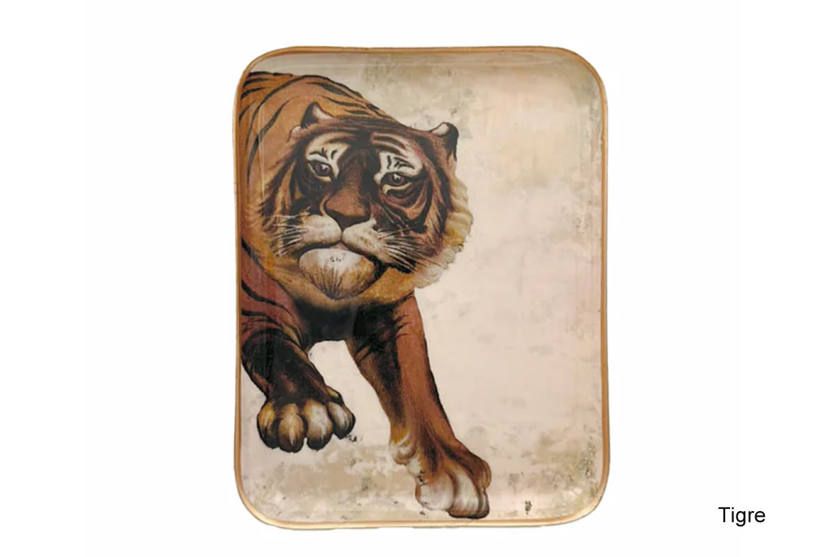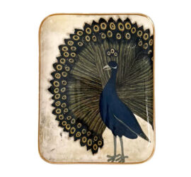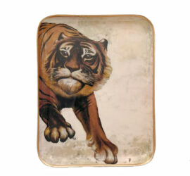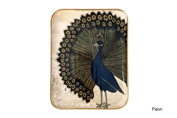 Brand: BoncoeursDescription: Rectangular enamelled tray in aluminum made by Boncoeurs. For serving or decorating, pretty motifs inspired by Indian “block prints”. Handmade with golden finishes. Available in 2 dimensions: Small 25 x 19 cm, Large 54 × 38 cm.