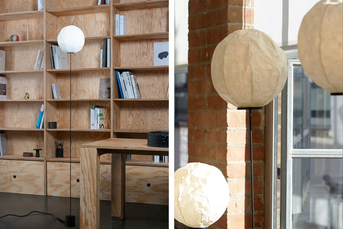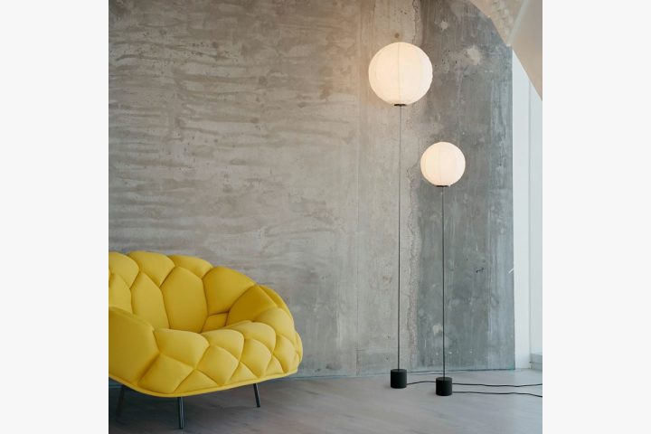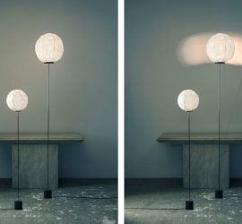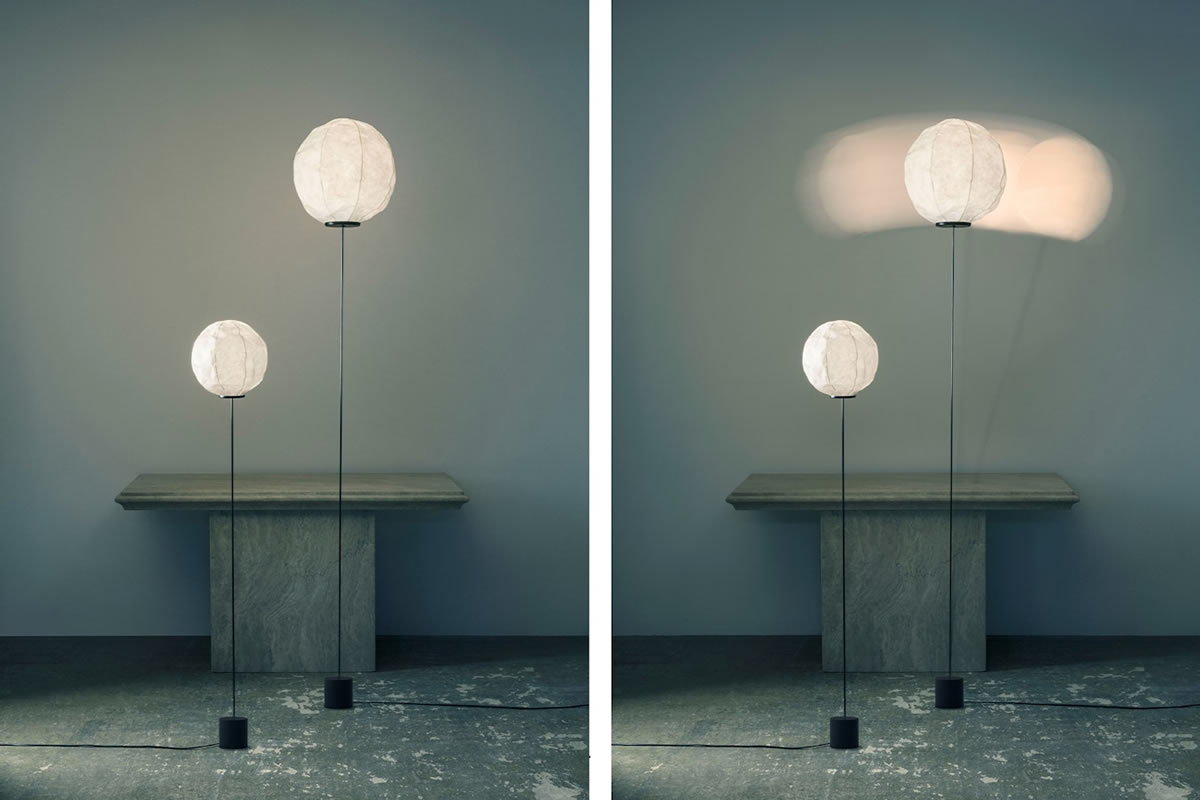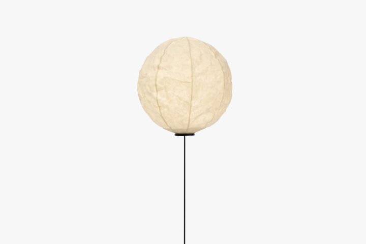 Description: Floor lamp by the young designer Dimitri Bähler produced by Established and sons. The crumpled Japanese Washi paper globe creates a diffused glow, adjustable via a dimmer. This shade is balanced with the carbon fiber rod, which extends from a weighted base. The tall, durable carbon fiber rod produces a ballerina-like movement when the light is touched, creating playfulness in the Cho Light’s deceptive simplicity. Dimensions: H192.5 cm, Ø37.5 × H163 cm.