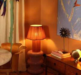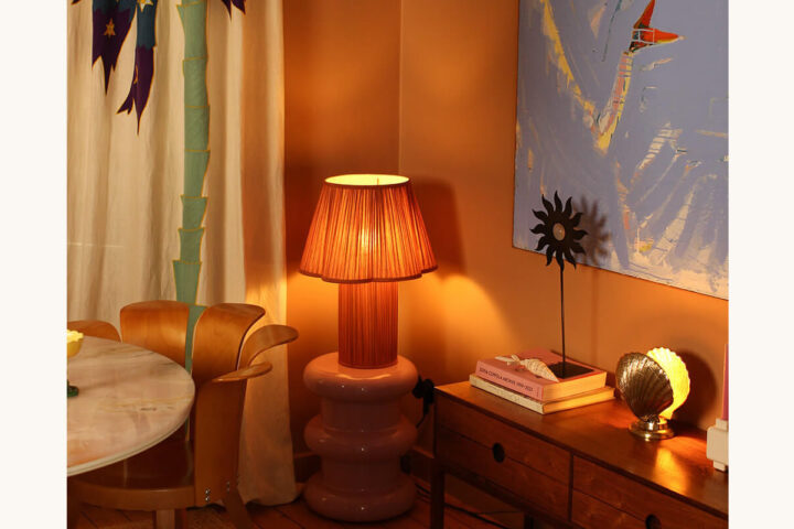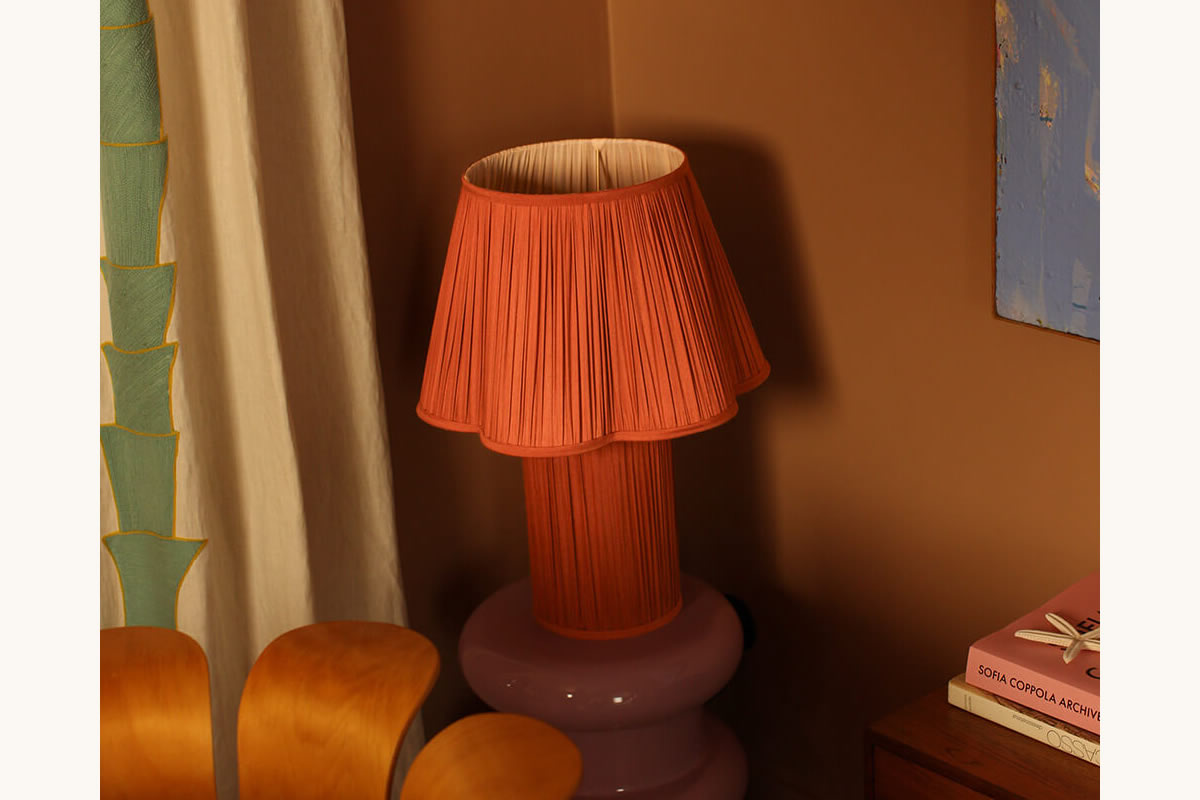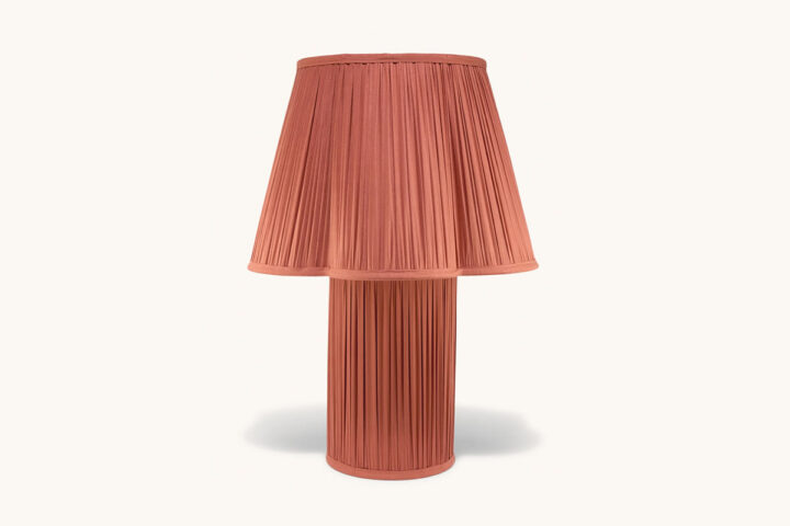 Description: Silk and viscose lamp produced by Doing Goods. Bring a subtle yet sophisticated glow into your home with this refined pleated lamp in an elegant bronze shade. Perfect for coffee tables, shelves or bedside tables. Dimensions: 57 x 40 x H18 cm.