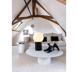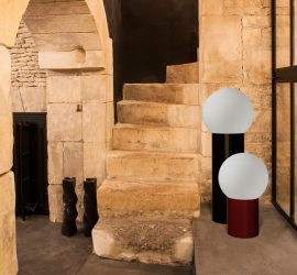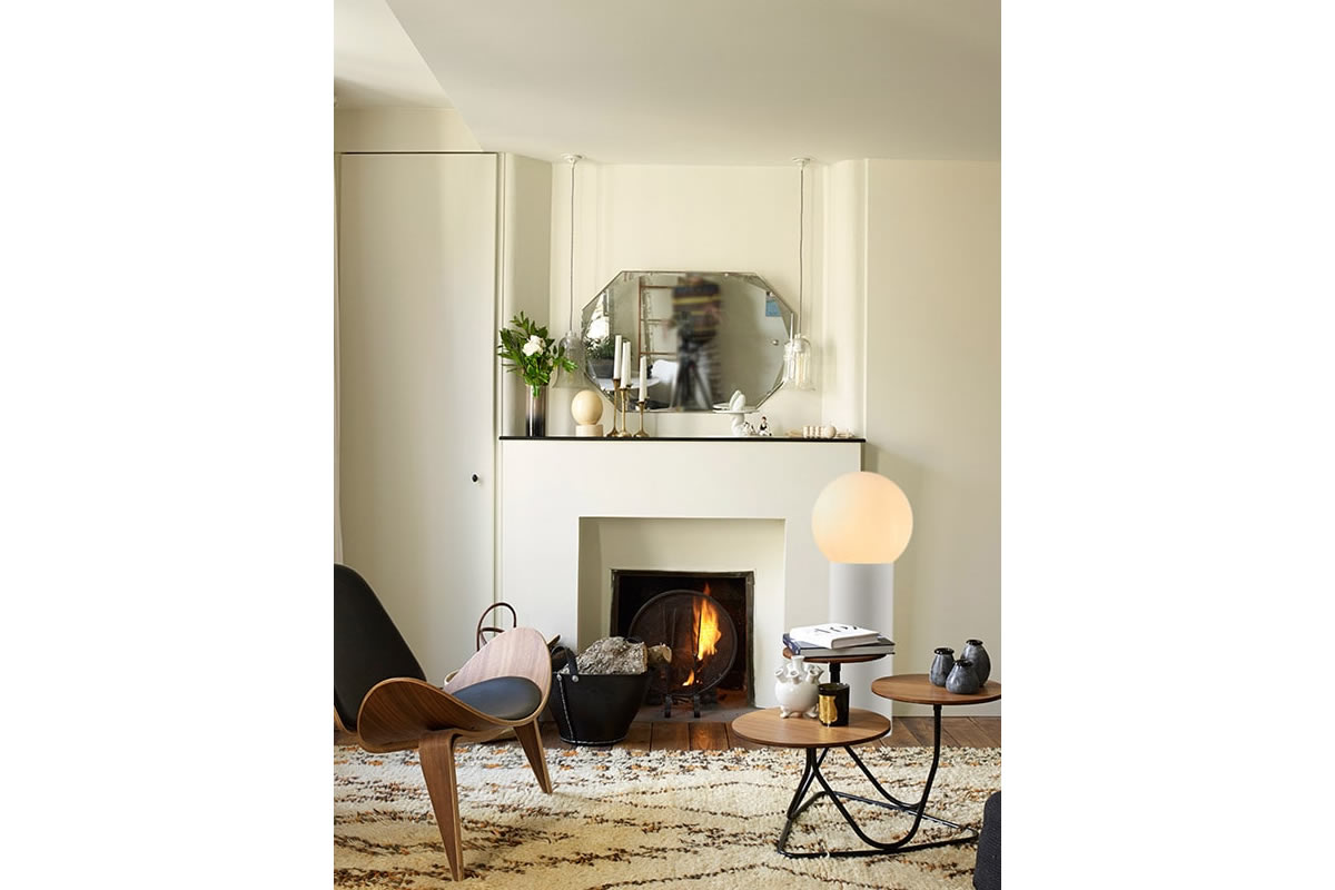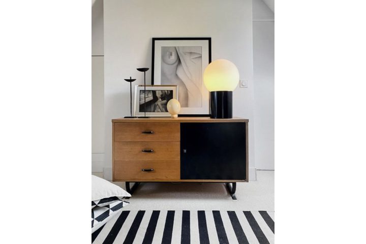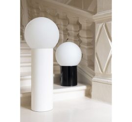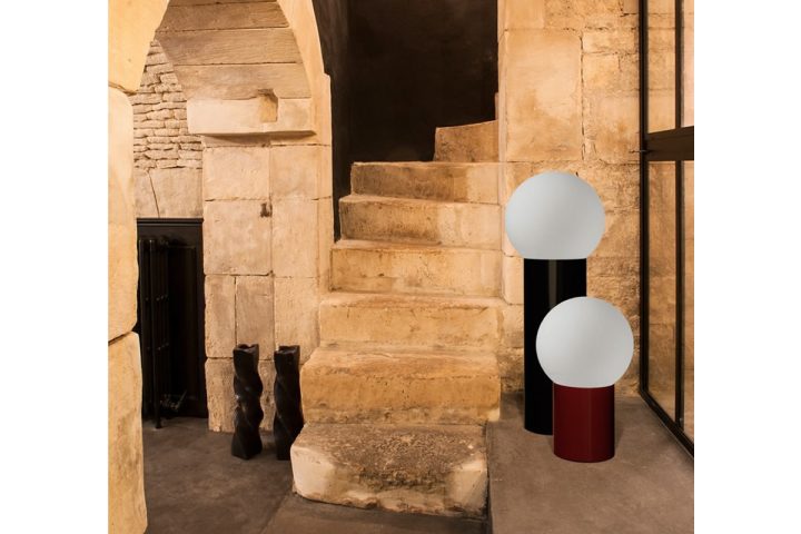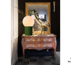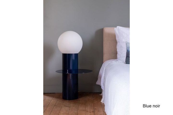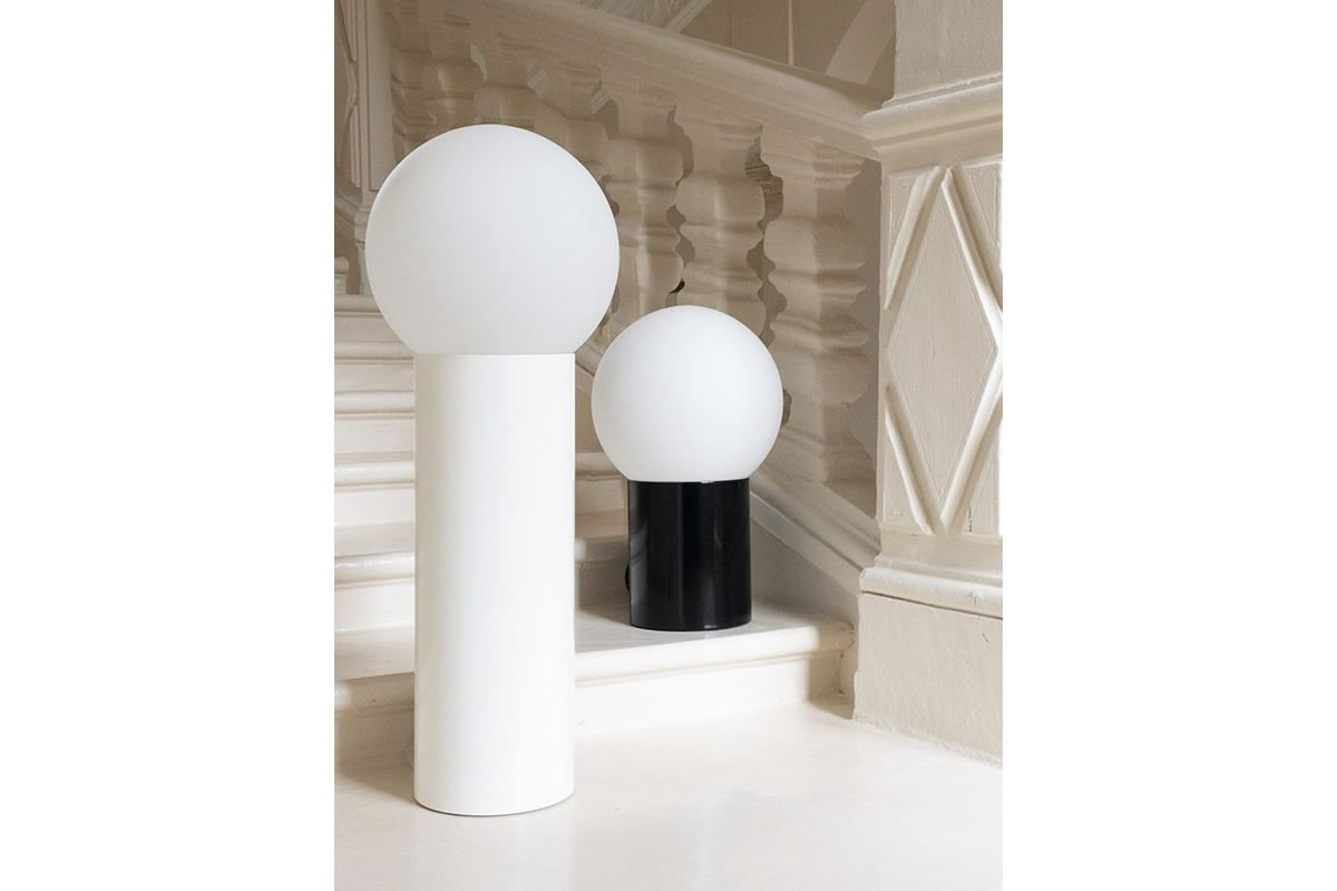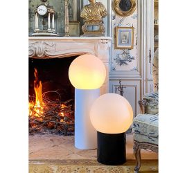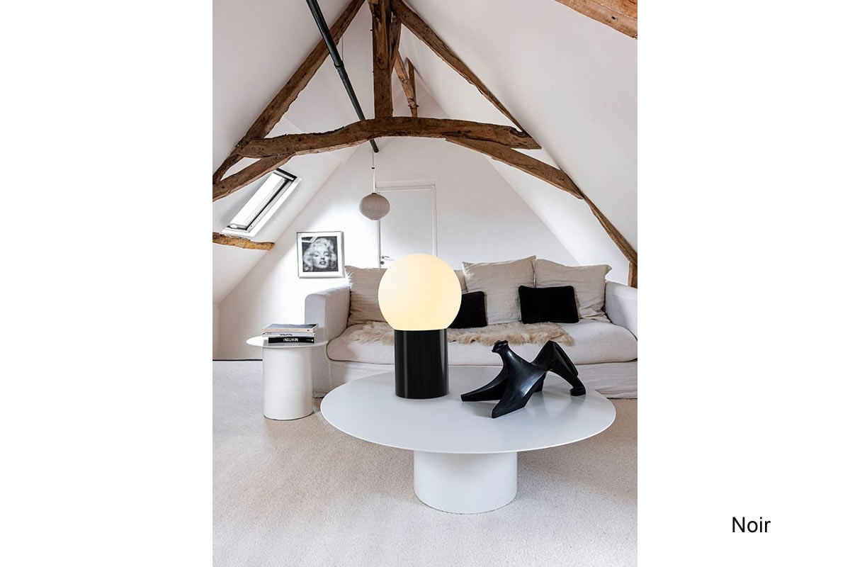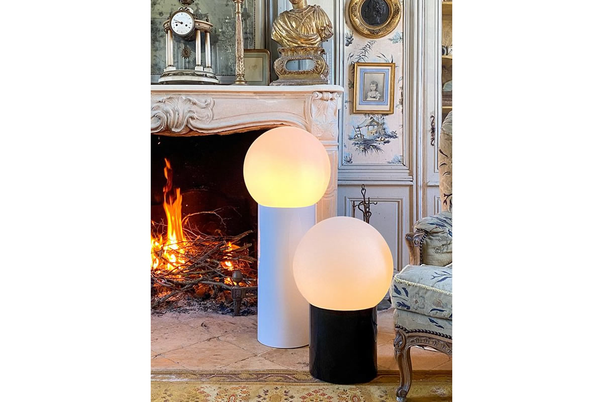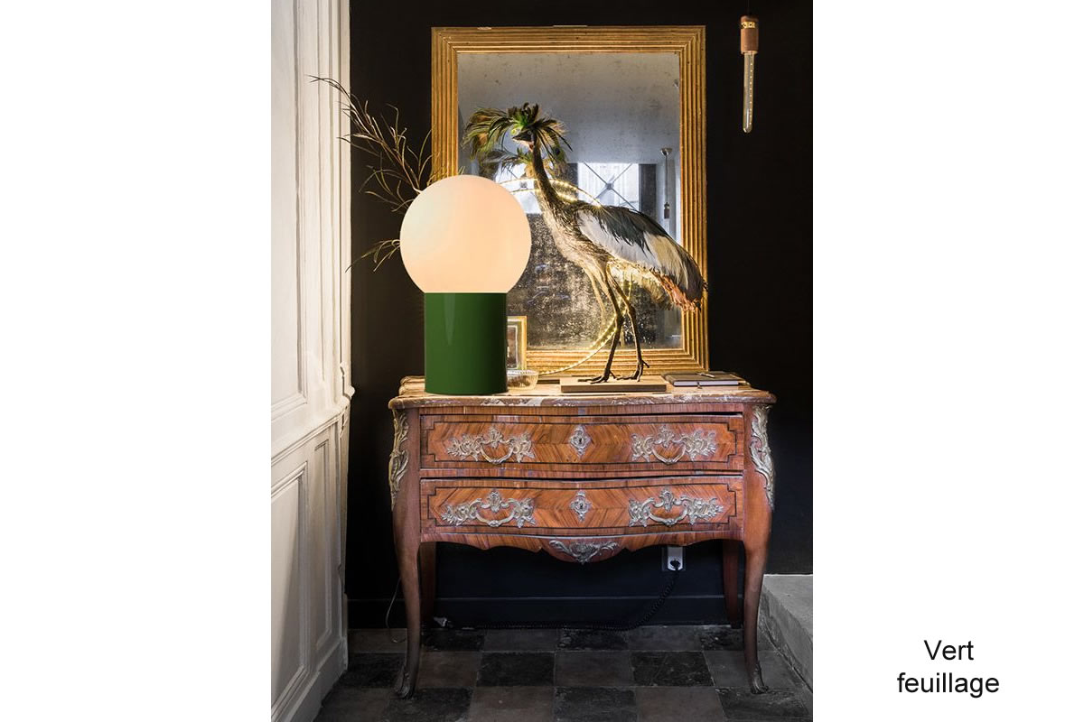 Brand: Laurence du TillyDescription: Table or floor lamp with powder-coated steel base and opaline globe made by Laurence du Tilly. A lamp inspired by the seventies that will find its place in all interior styles. Its globe will diffuse a soft and intensity-adjustable light thanks to the dimmer. Dimensions: Small Ø35 x H56 cm, large Ø35 x H90 cm, Table 22 × 50 × H90 cm.