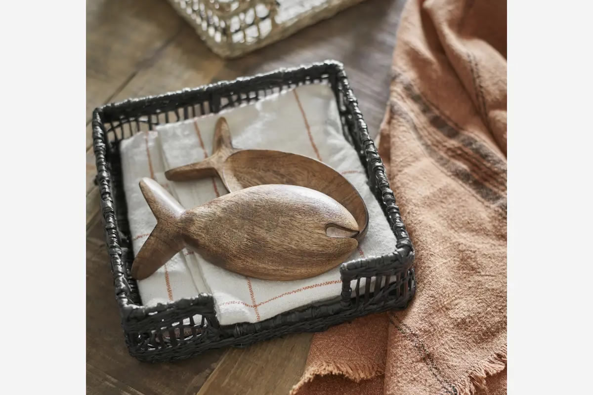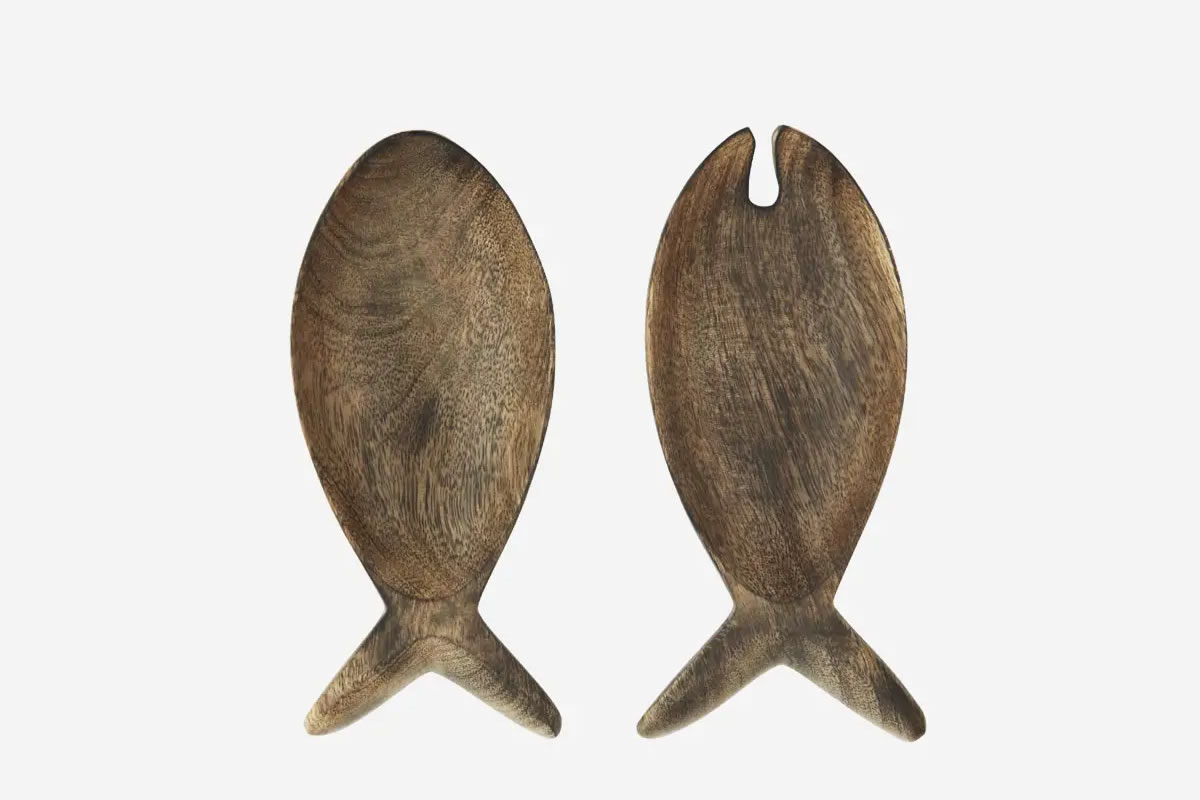 Brand: Madam StoltzDescription: Set di 2 posate da portata in legno a forma di pesce realizzate da Madam Stolz. Realizzate a mano, porta un tocco di rustico al tuo tavolo, perfette per servire le vostre insalate, verdure o piatti misti. Dimensioni: circa 16 cm.