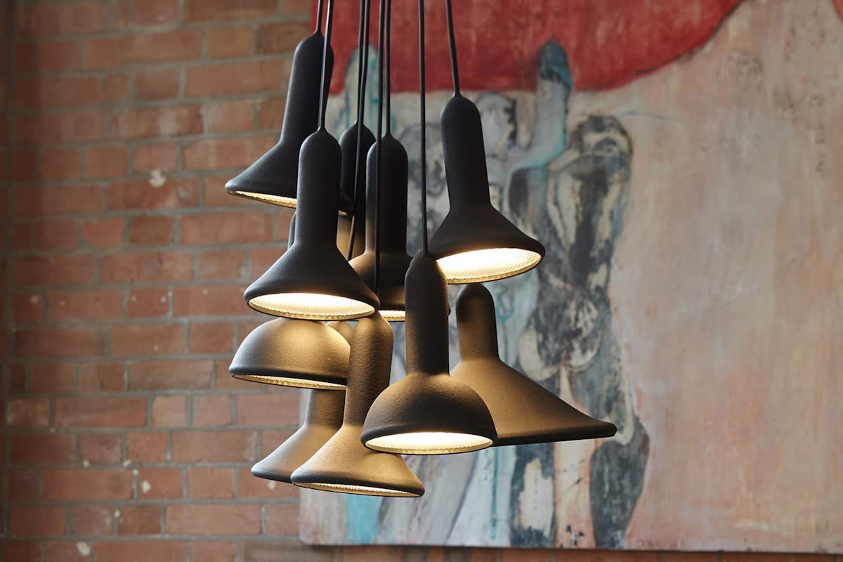 Description: Lampada a sospensione composta da 10 “torcie” con paralume in silicone stampato tattile e diffusore con texture diamantata realizzata da Estabilished and Sons. Look divertente e vibrante grazie alle diverse dimensioni dei paralumi dallo stile audace adatto a diversi tipi di ambienti. Dimensioni: 6 coni Ø15 cm, 3 cerchi Ø15, 1 cono Ø30 cm.